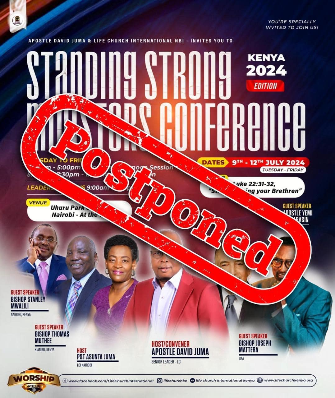 Shalom and choice greetings in the Name of Our Lord Jesus Christ. We regret to inform you that owing to the ongoing protests and riots (which have manifested in the destruction of both private and public infrastructure) the Conference has been postponed.